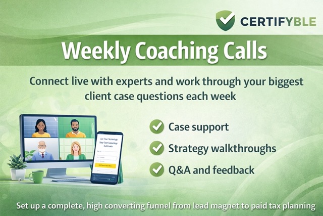 Certifyible Weekly Coaching Calls CertifyibleWeekly Coaching Calls are your live, weekly space to get real-time support as you build and grow your tax and accounting firm. Each call is designed t...
